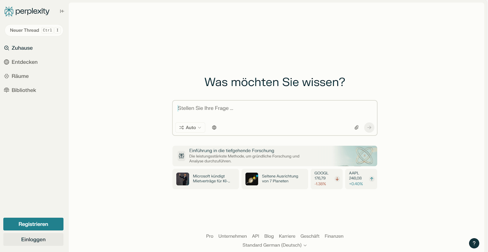 KI-Suchmaschinen verwenden KI-Modelle, um Informationen aus dem Internet zu verstehen und zu präsentieren. Anstatt sich zu jeder Website durchzuklicken, erhalten Sie eine praktische Zusammenfassung aller wichtigen Informationen. KI-Suchmaschinen eignen sich hervorragend, um sich einen Überblick über ein komplexes Thema zu verschaffen, systematisch zu recherchieren und immer auf dem neuesten Stand zu bleiben.