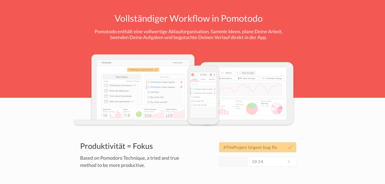 Pomotodo ist eine von Pomodoro inspirierte Zeitmanagement-App für Kreative. Sie wurde entwickelt, um Ihnen zu helfen, Ihren Arbeitsfluss mit Funktionen wie einer Aufgabenliste, Zeiterfassungsberichten und Leistungsstatistiken zu verwalten.