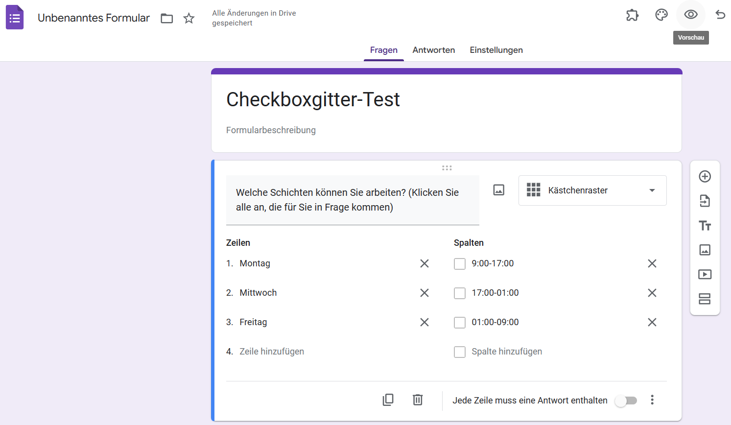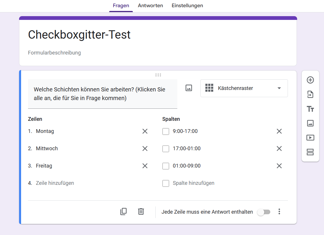 - Dadurch wird ein Checkboxgitter erstellt, das Sie mit den gewünschten Fragen und Antwortoptionen anpassen können. Bearbeiten Sie es nach Ihren Bedürfnissen. Dieses Beispiel zeigt, wie Sie es für die Schichtplanung verwenden können.