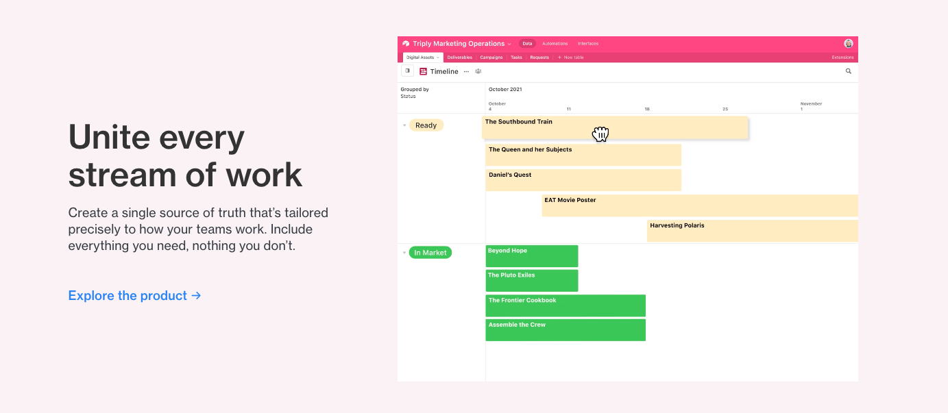 Mit Airtable können Teams auf einfache Weise Anwendungen erstellen, die ihre Arbeitsflüsse, Teams und Daten miteinander verbinden. Die hochgradig anpassbare Funktionalität und Architektur von Airtable ist ideal für Unternehmen, die besondere Projektmanagement-Anforderungen haben. Die Automatisierungsfunktionen von Airtable zur Optimierung von Arbeitsflüssen und sich wiederholenden Aufgaben sind besonders hervorzuheben.