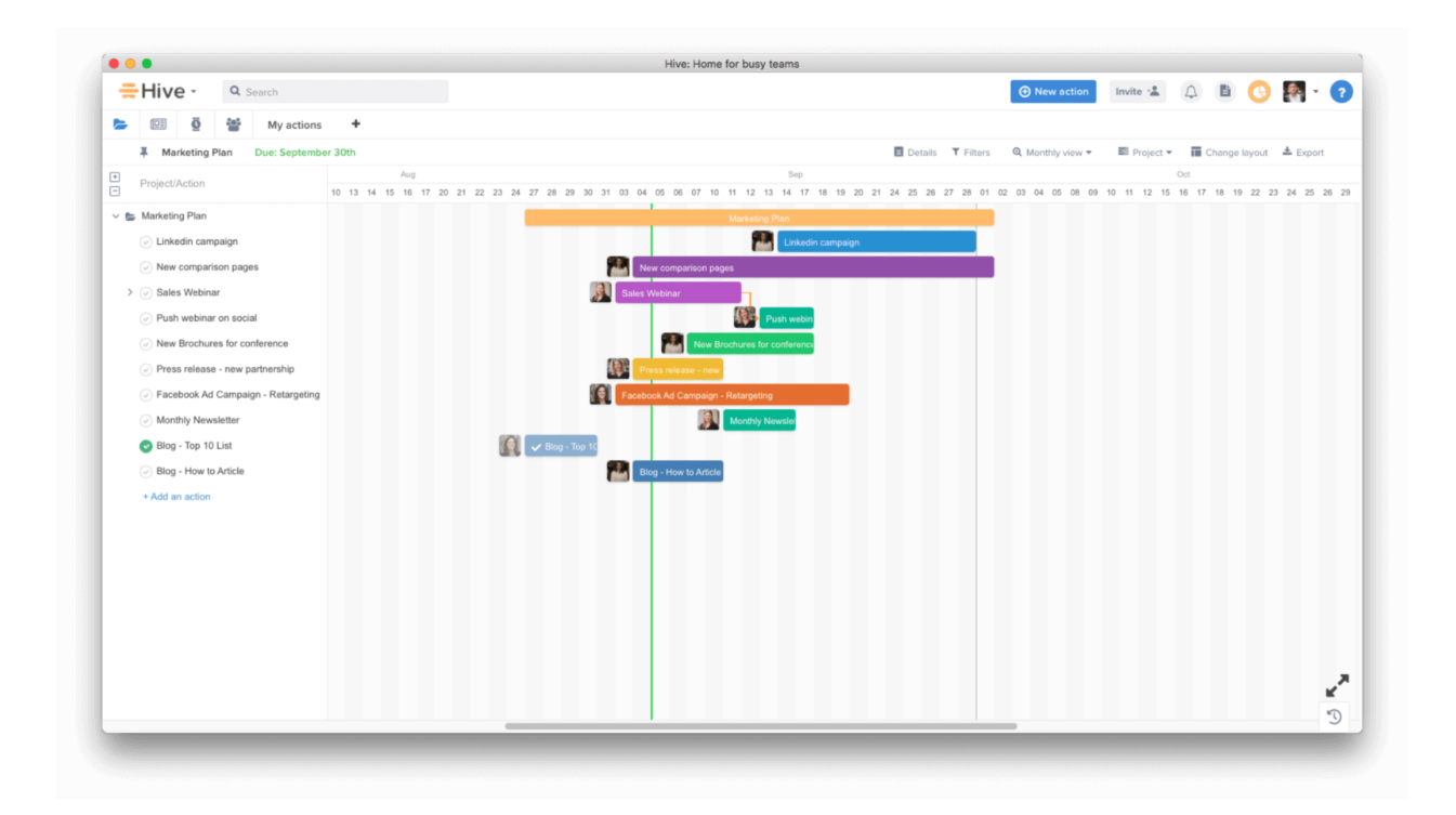 Hive ist eine großartige ClickUp Alternative, bei der es vor allem darum geht, dass Teams schneller arbeiten können. Benutzer können benutzerdefinierte Zusammenfassungs-Ansichten erstellen, damit sie nur die Informationen sehen, die sie benötigen, ohne von zusätzlichen Details überwältigt zu werden. Hive verfügt außerdem über ein intuitives Dashboard, das Berichte zu grundlegenden Aspekten wie Zeitmanagement und Ressourceneinsatz enthält.
