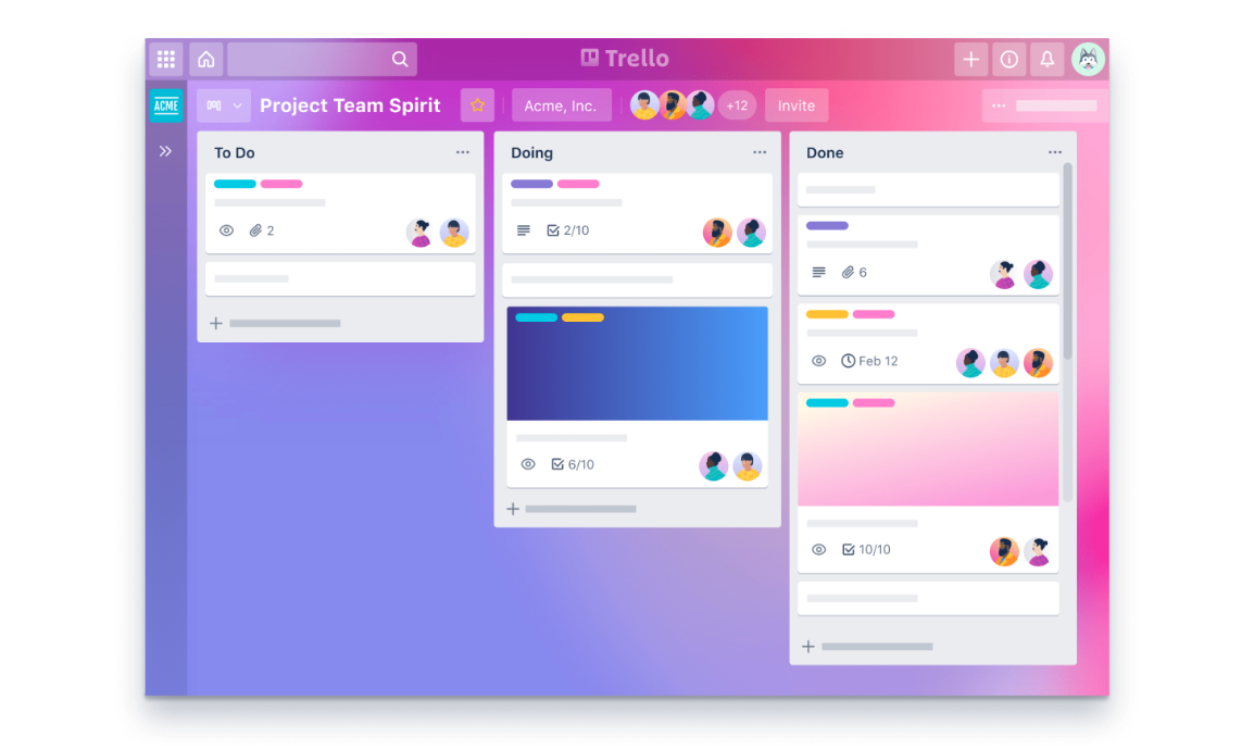 Trello ist eine ClickUp Alternative, die sich darauf konzentriert, Teams voranzubringen. Mithilfe eines Pinnwand-Formats können Trello-Nutzer Listen und Karten für jede Aufgabe erstellen und sie entlang eines Pfads von Projektfortschrittsmeilensteinen bewegen, während sie jeden Schritt abschließen.