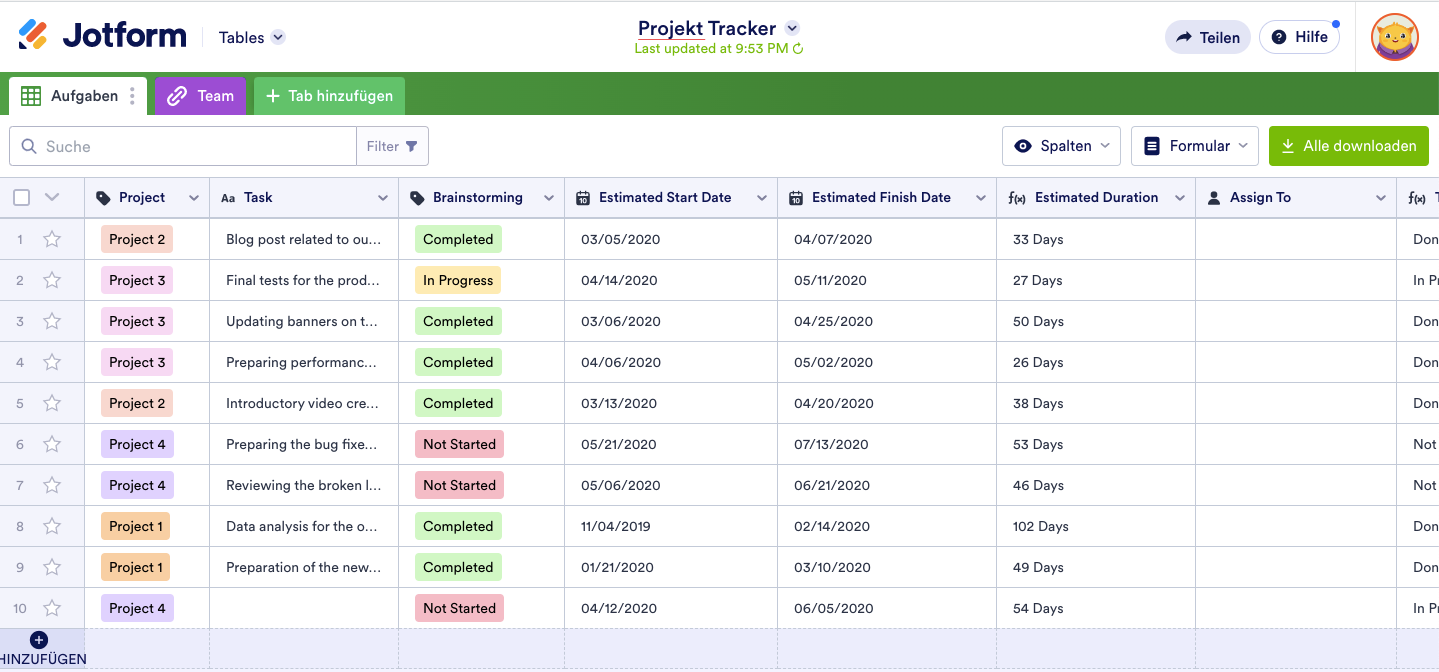 Jotform ist nicht nur ein Online-Formularersteller, sondern auch ein exzellentes Tool für das Projektmanagement. Alle über Ihre Formulare gesammelten Daten werden automatisch in eine Tabelle eingetragen, in der Sie den Fortschritt der Aufgaben verfolgen, mit Ihrem Team zusammenarbeiten, komplexe Berechnungen durchführen und die Daten mit einem speziellen Report Builder analysieren können, der alle Beteiligten auf dem gleichen Stand hält. Es stehen mehrere kostenlose Projektmanagement-Vorlagen zur Verfügung, die alle anpassbar sind.