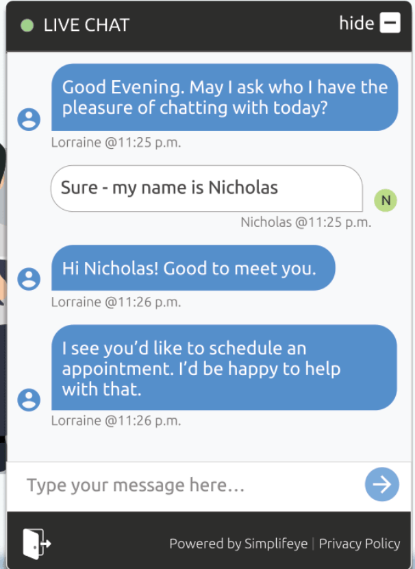 Simplifeye ist ein Chat-Service, den Zahnarztpraxen rund um die Uhr nutzen können, um Patienten anzusprechen, die ihre Website besuchen. Die Plattform verfügt über eine Web-Chat-App und ein Team von geschulten Chattern – eine einzigartige Funktion unter ähnlichen Lösungen. Damit können Sie die Verwaltung Ihres Webchats vollständig an Simplifeye auslagern, so dass sich Ihr Personal auf die Arbeit in der Praxis konzentrieren kann.