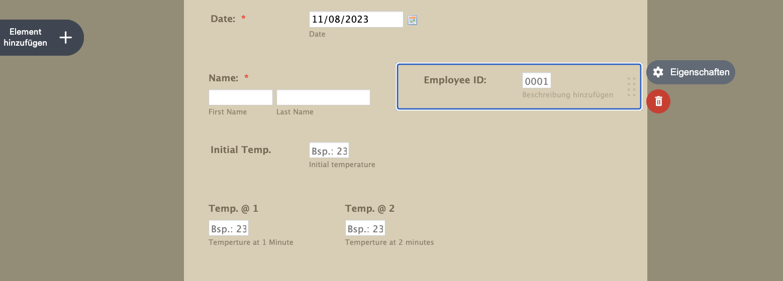 - Um Felder zu IHrem Formular hinzuzufügen, klicken Sie den Button Element hinzufügen links am Bildschirm.