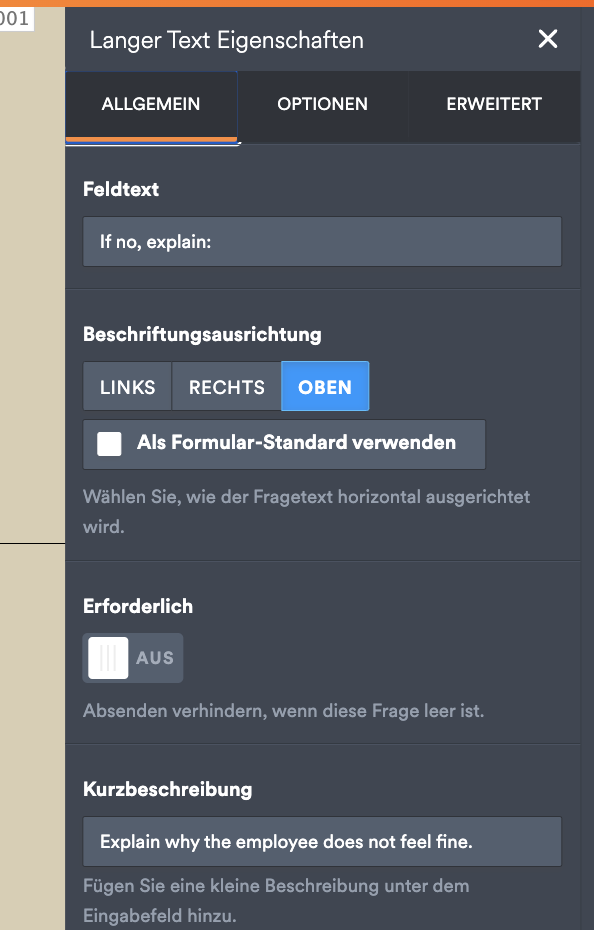 - Um existierende Felder im Formular anzupassen, klicken Sie jede Box und dann den Button Eigenschaften rechts, um das passende Untermenü zu öffnen.
