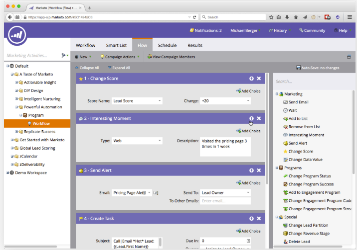 - Hauptfunktionen: Adobe Marketo Engage bietet einen breit gefächerten Ansatz für Marketing-Automatisierung und Kundenbindung. Die Tools sind so konzipiert, dass sie Kundendaten, Inhalte, Automatisierungs- und Analysefunktionen zusammenführen, die für die Koordination zwischen Ihren Marketing- und Vertriebsteams erforderlich sind. Das Ergebnis: personalisierte und messbare Datenpunkte, die auf dem Engagement Ihrer Marke bei den Kunden basieren.