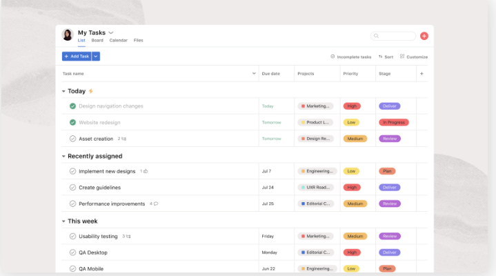 - Hauptfunktionen: Asana ist eine weitere beliebte Wahl für das Projektmanagement und die Organisation von Marketingaufgaben. Verwalten Sie Fälligkeitstermine, Aufgaben und Projekte über das intuitive Dashboard-Layout von Asana, das Sie nach Datum, Status und mehr neu konfigurieren können. Mit der Asana-Integration von Jotform können Sie neue Projekte erstellen, Aufgaben zu bestehenden Projekten hinzufügen und vieles mehr.