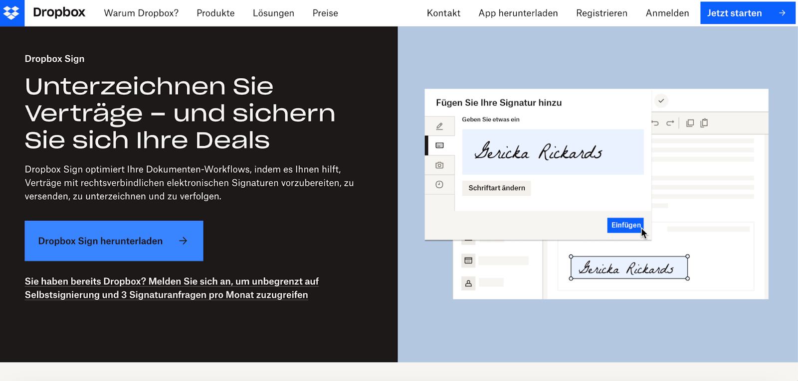 Dropbox Sign ermöglicht es Nutzern, Unterschriften zu jedem digitalen Dokument anzufordern und hinzuzufügen.