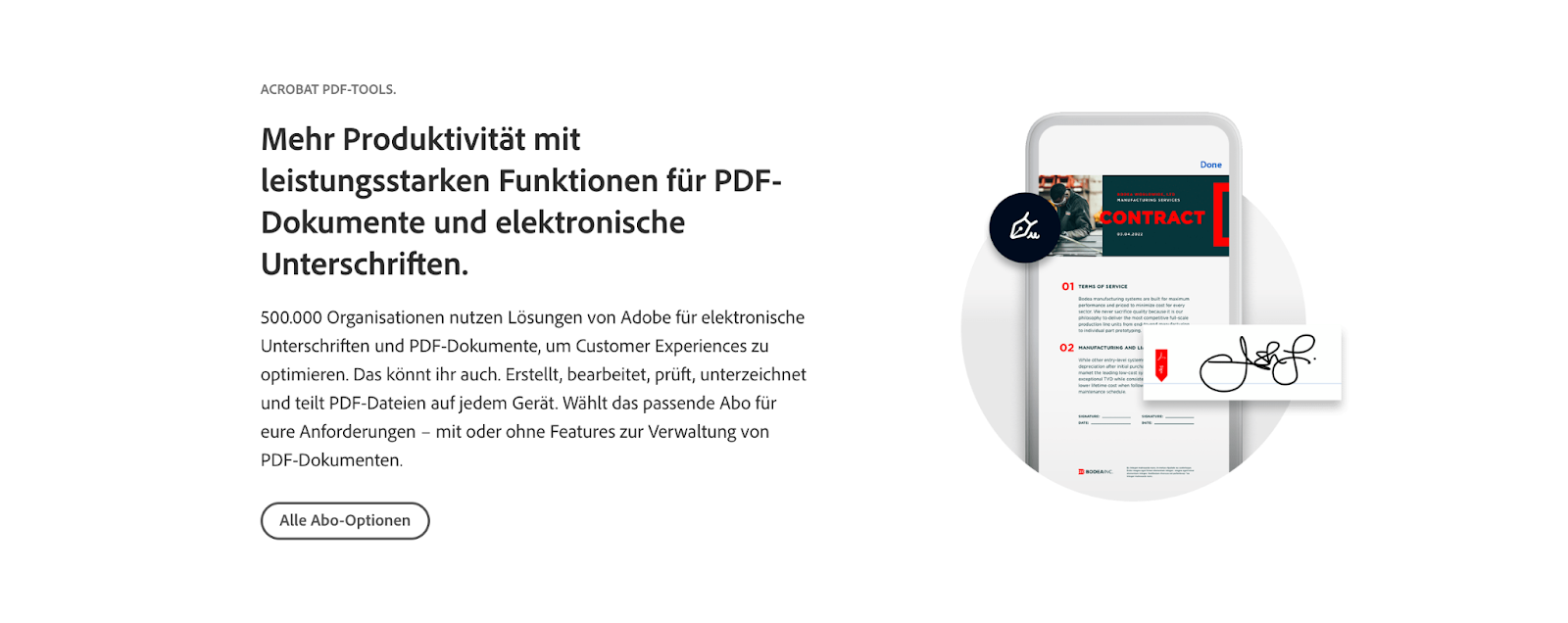 Adobe Acrobat Sign ist Teil der Adobe Document Cloud und umfasst PDF- und elektronische Signaturlösungen. Die Software erlaubt es Ihnen, Dokumente innerhalb weniger Minuten zu unterzeichnen und erstellt fälschungssichere Dokumente für die digitale Unterzeichnung.