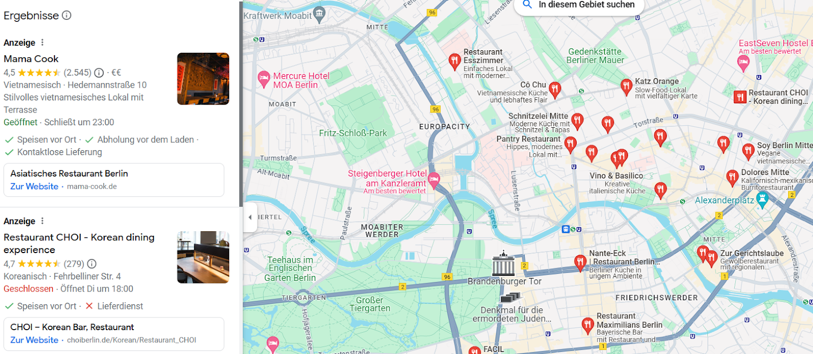 Google-Bewertungen können auch bestimmen, ob Ihr Unternehmen als Teil einer Gruppe von Unternehmen in der Karte mit den lokalen Suchergebnissen angezeigt wird. Diese Gruppe von Unternehmen wird als Map Pack oder Google Local Map Pack bezeichnet. Negativ bewertete Unternehmen werden mit geringerer Wahrscheinlichkeit darin auftauchen.