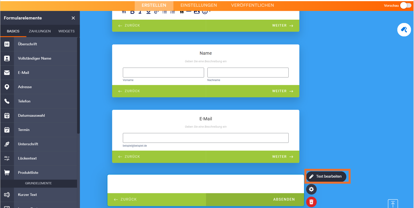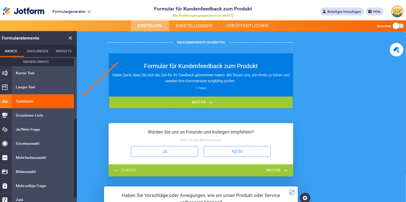 Klicken Sie dann auf Textabsatz, um ihn dem Formular hinzuzufügen.