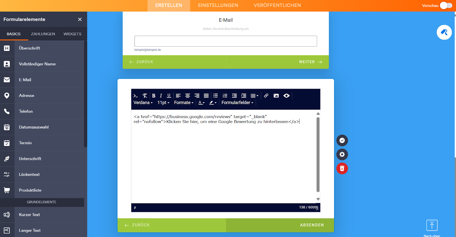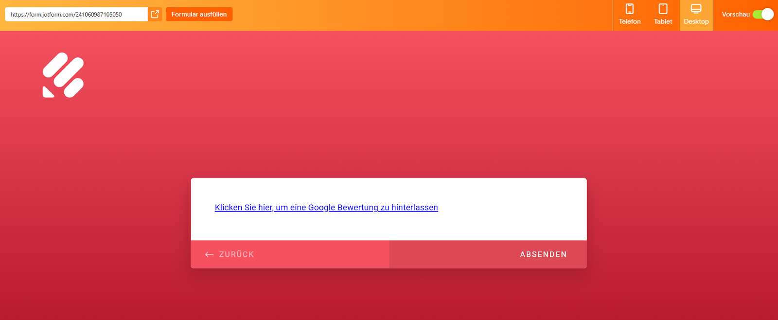 Viele Unternehmen verwenden Feedback-Umfragen, um Daten von ihren Kunden zu erfassen. Wenn Sie ein Tool wie Jotform verwenden, um Feedback-Umfragen zu erstellen, können Sie einen Link zur Abgabe einer Google-Bewertung in die Umfrage einbetten. Sie können diesen Link auch in Social Media-Kanäle, Websites oder jedes andere Medium einfügen, in dem Sie Feedback erfassen.