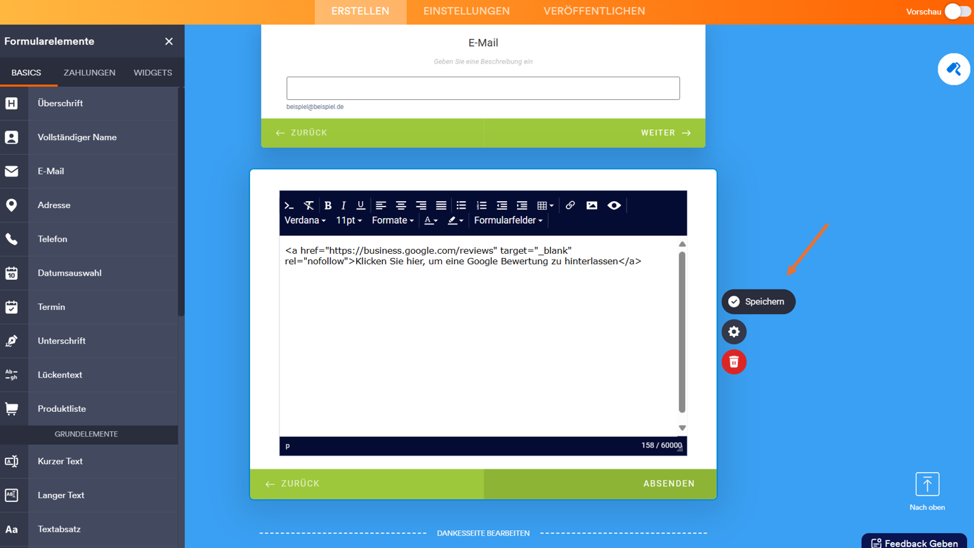Klicken Sie auf das Häkchen, um das Formular zu speichern.