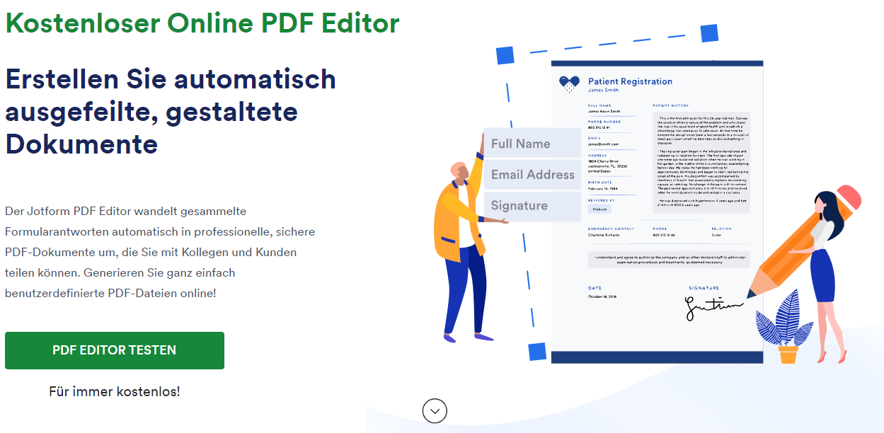 Die Standardlayouts für Formularergebnisse sind ohnehin schon sehr schön. Aber was ist, wenn Sie ihnen etwas mehr Flair verleihen, Bilder hinzufügen oder das Layout an Ihre Marke anpassen möchten? Hier lässt Sie Google Forms im Stich, Jotform hingegen stärkt Ihnen den Rücken. Wir haben einen PDF-Editor, mit dem Sie die Ergebnisse eines jeden Formulars bearbeiten können. Er ist benutzerfreundlich, leistungsstark und bei allen Jotform Plänen kostenlos, sogar beim kostenlosen Starter-Plan.