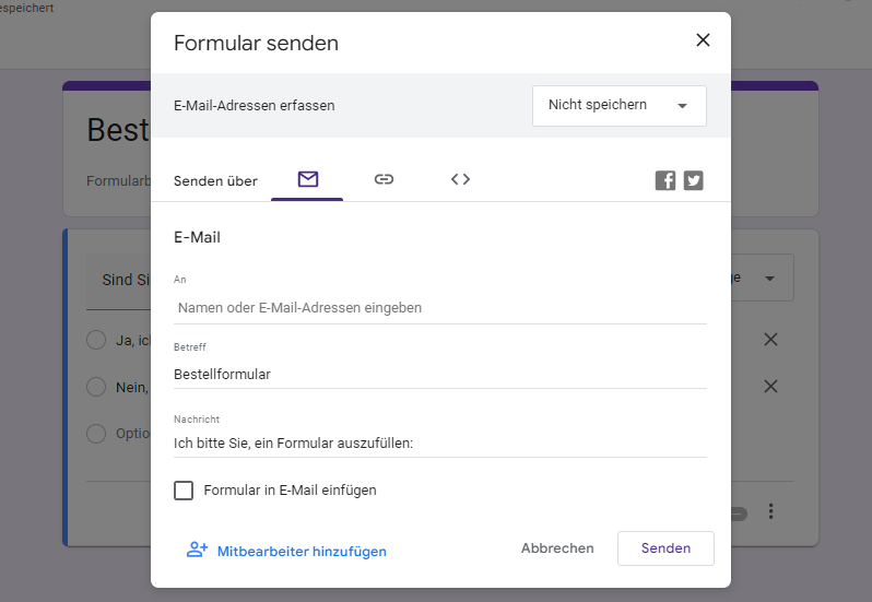 - Versenden Sie. Sie können eine Google Forms-Bestellung direkt an die Genehmigenden und später an die Lieferanten per E-Mail oder über einen teilbaren Link versenden.