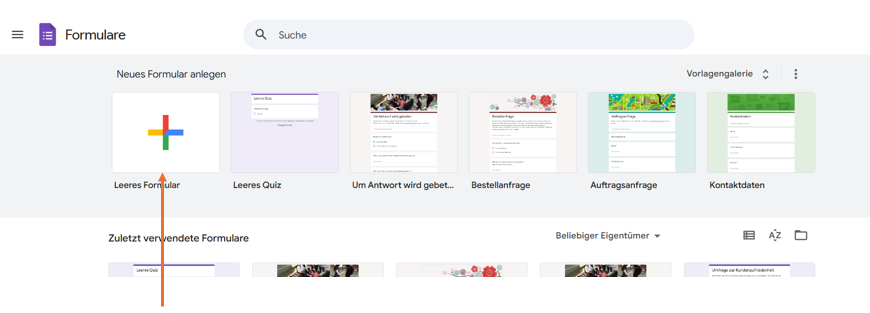 - Öffnen Sie auf der Startseite von Google Formulare ein bestehendes Formular oder erstellen Sie ein neues, indem Sie die Schaltfläche Leeres Formular oben auf der Seite auswählen.
