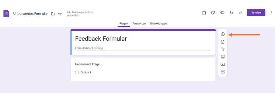 2. Wählen Sie im Formularersteller das Plus-Symbol in der Symbolleiste auf der rechten Seite, um Ihrem Formular Fragen hinzuzufügen. Die Anzahl der Fragen, die Sie hinzufügen können, ist zwar nicht begrenzt, aber Sie sollten bedenken, dass Sie bei einer kurzen oder mittelgroßen Umfrage wahrscheinlich mehr Antworten erhalten.