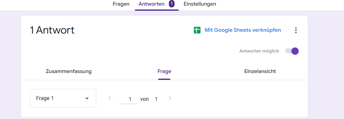 Wenn Sie die Beantwortungen in einer Tabellenansicht sehen möchten, können Sie sie mit Google Formulare mit einem Google Sheet verknüpfen oder sie in eine CSV-Datei herunterladen. Wählen Sie im Bildschirm Antworten den Button Mit Tabellen verknüpfen und wählen Sie dann im Dialogfeld aus, ob Sie ein neues Tabellenblatt für die Daten erstellen oder ein bestehendes Tabellenblatt auswählen möchten. Um die Antworten herunterzuladen, wählen Sie das Symbol mit den drei Punkten und klicken Sie auf Antworten herunterladen (.csv).