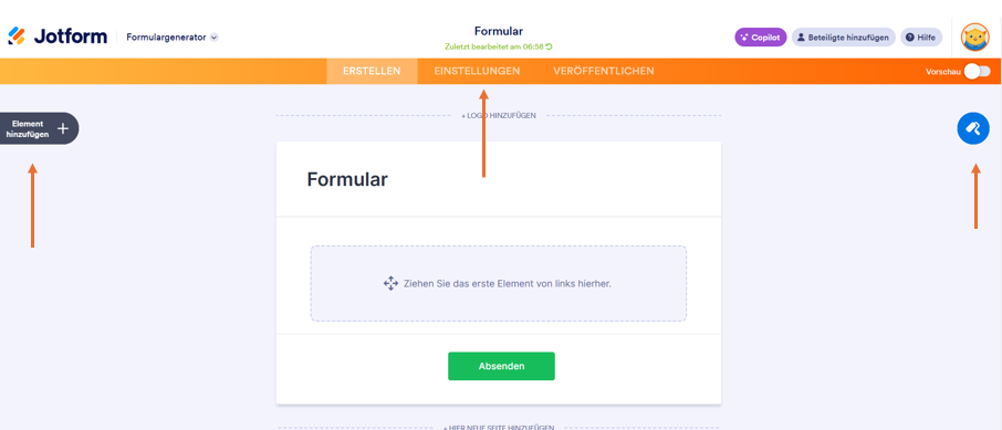 - Im Formulargenerator können Sie Fragen und andere Felder hinzufügen, indem Sie auf den Button Formularelement hinzufügen klicken und ein Formularelement auswählen oder es per Drag & Drop in Ihr Formular ziehen, auf die Optionen zur Designanpassung zugreifen, indem Sie auf den Button Formulardesigner klicken, und die Einstellungsoptionen des Formulars anzeigen, indem Sie auf die Registerkarte Einstellungen klicken.