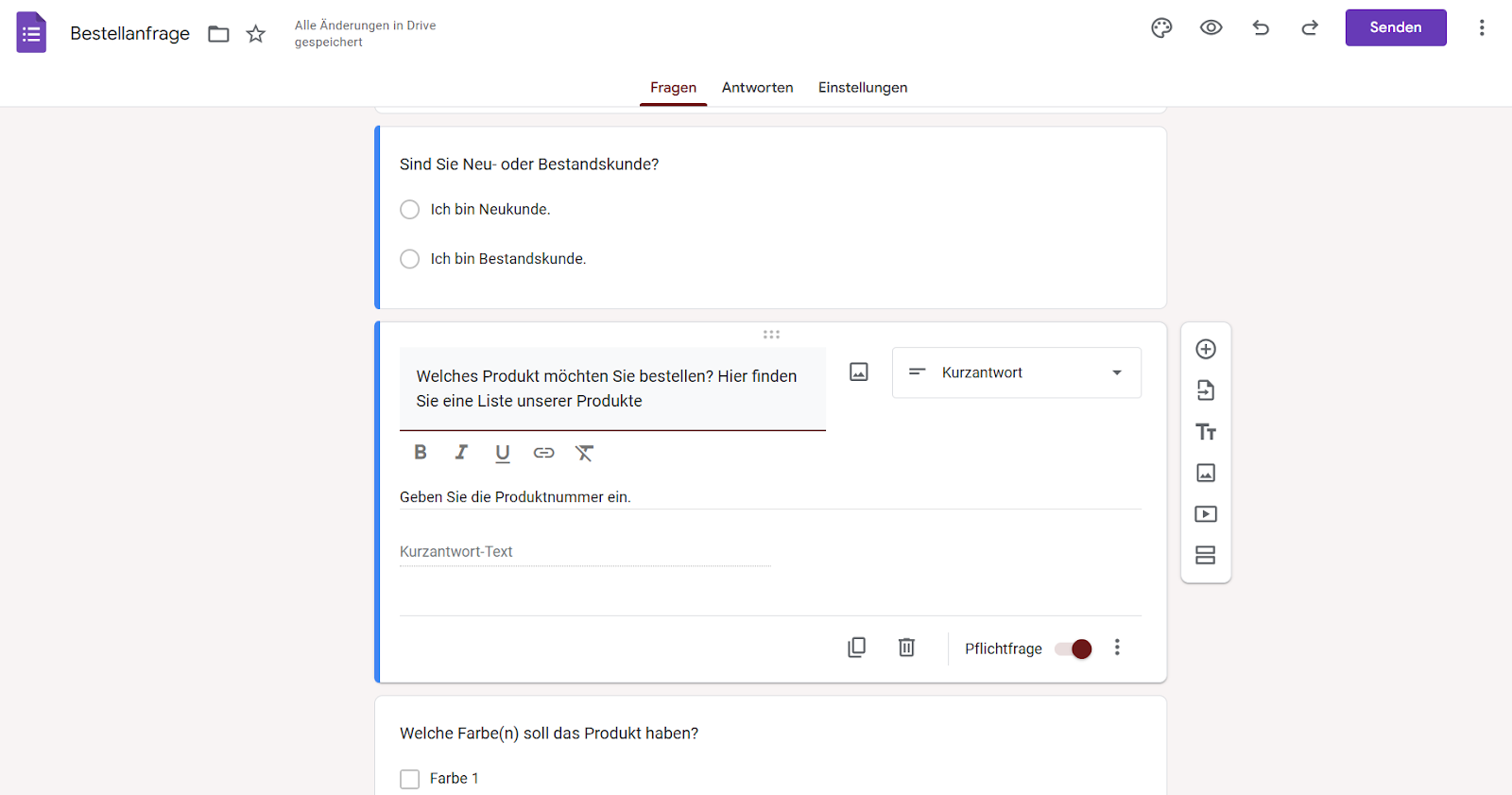 7. Teilen Sie Ihr Formular, indem Sie oben rechts auf der Seite auf „Senden“ klicken. Wählen Sie aus, wie Sie es teilen möchten, ob per E-Mail, durch Verlinkung oder durch Einbettung.