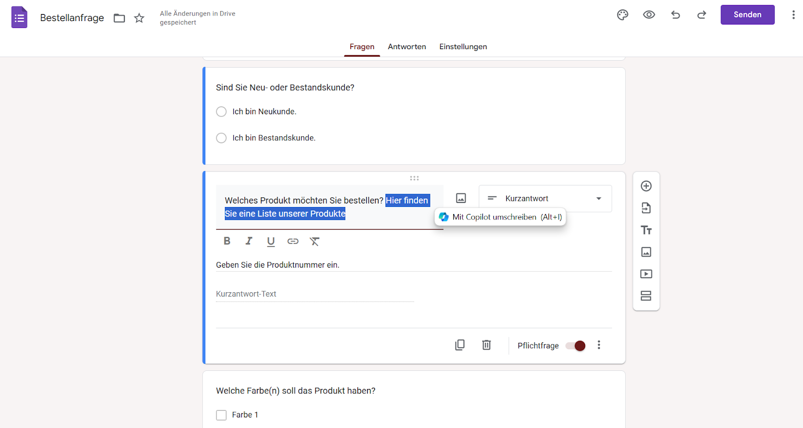 - Fügen Sie die Frage hinzu, in die Sie einen Hyperlink einfügen möchten. In diesem Fall fügen wir die Frage „Welches Produkt möchten Sie bestellen? Hier finden Sie eine Liste unserer Produkte.“