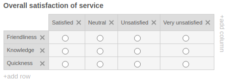 Sie könnten zum Beispiel die Zufriedenheit Ihrer Kunden mit Ihren Mitarbeitern in einem Raster erfassen wollen. Wenn Sie sie auch nach der Sauberkeit Ihrer Einrichtungen fragen möchten, können Sie ein weiteres Raster hinzufügen.