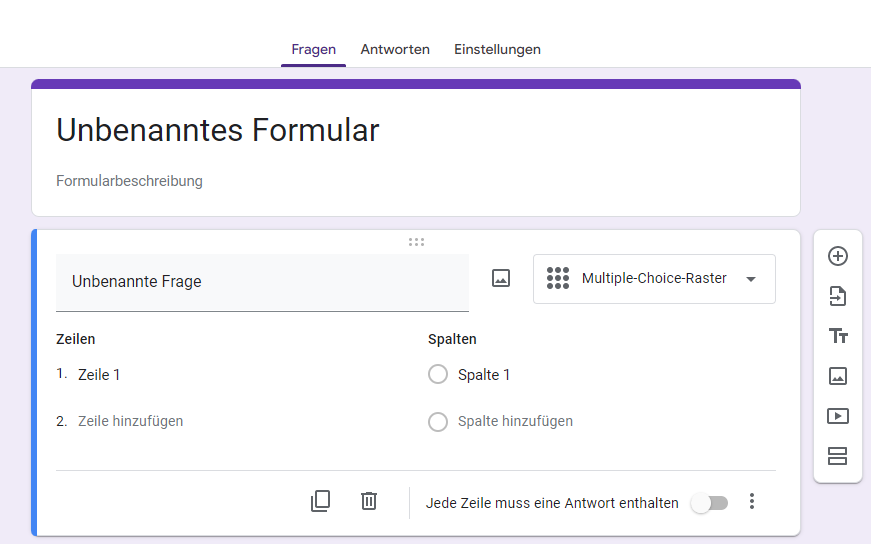 Sie können neue Fragen hinzufügen, indem Sie auf Zeile hinzufügen klicken, und Sie können Antworten hinzufügen, indem Sie auf Spalte hinzufügen klicken. Sie können auch Fragen und Antworten löschen, indem Sie auf das X neben den Fragen klicken.