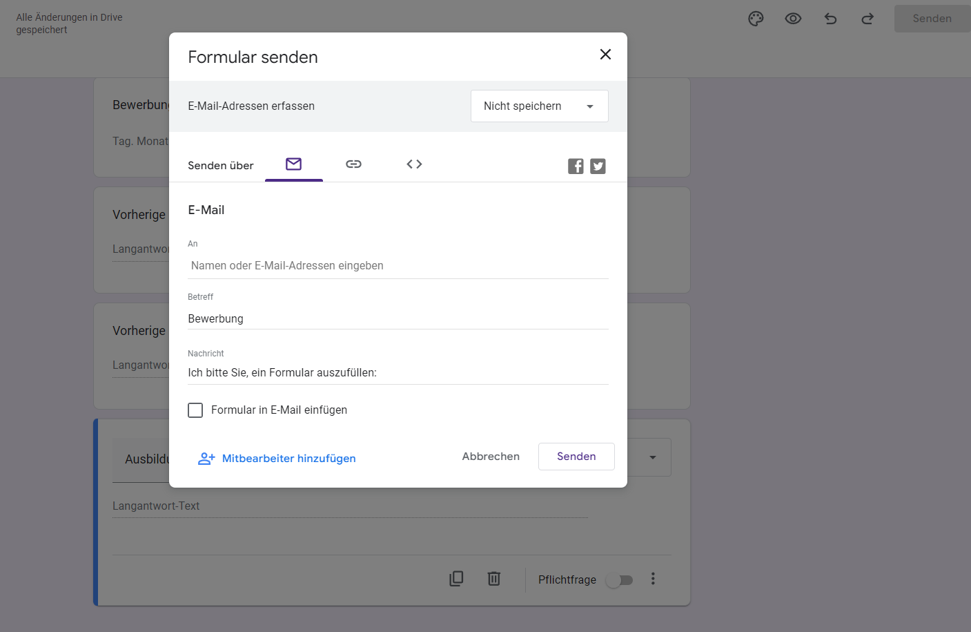 - Um Ihr Formular zu teilen, klicken Sie auf den Button Senden