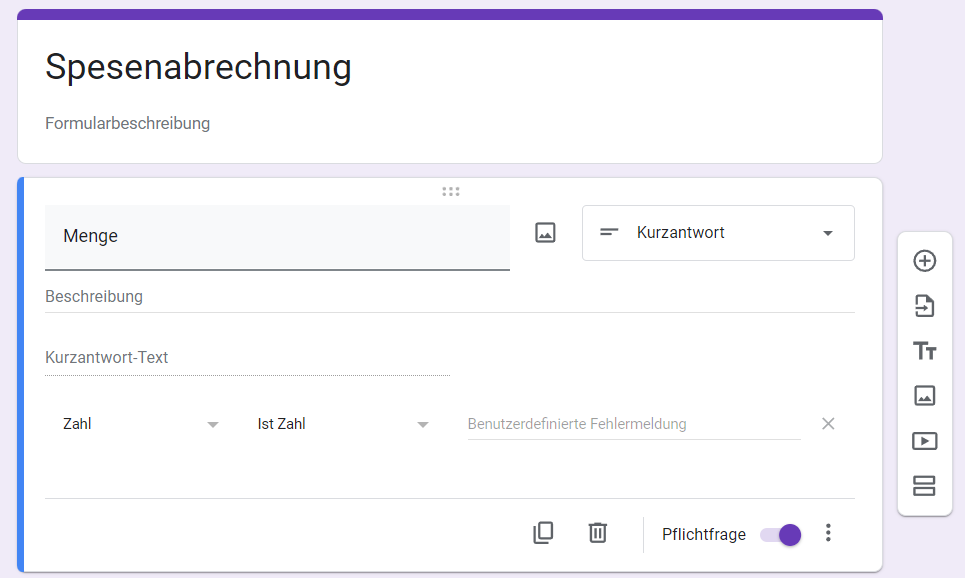 - Klicken Sie auf den Button + im rechten Menü, um die nächste Frage zu erstellen. Hier geht es um zusätzliche Informationen zu den Ausgaben.