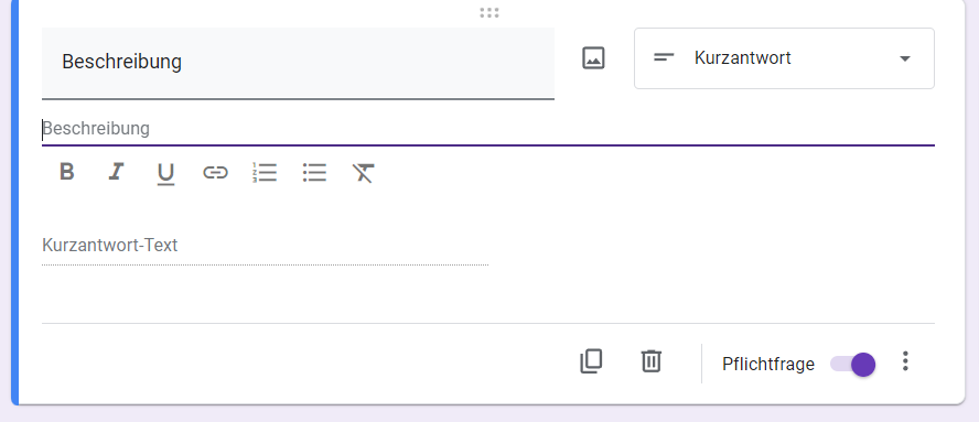 - Nennen Sie die neue Frage Beschreibung und ändern Sie den Fragetyp in Kurzantwort.