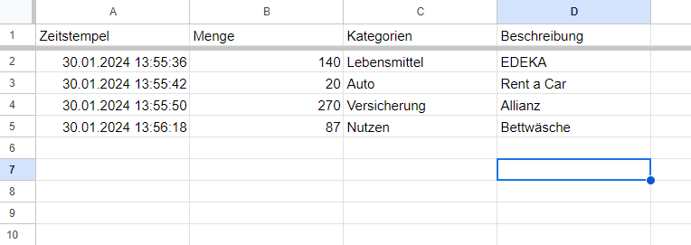 - Die Tabelle ist bereits mit Spaltenbeschriftungen versehen, die mit den Fragen des Formulars übereinstimmen. Die Antworten werden automatisch in das Arbeitsblatt eingefügt, wenn Sie neue Ausgaben hinzufügen.