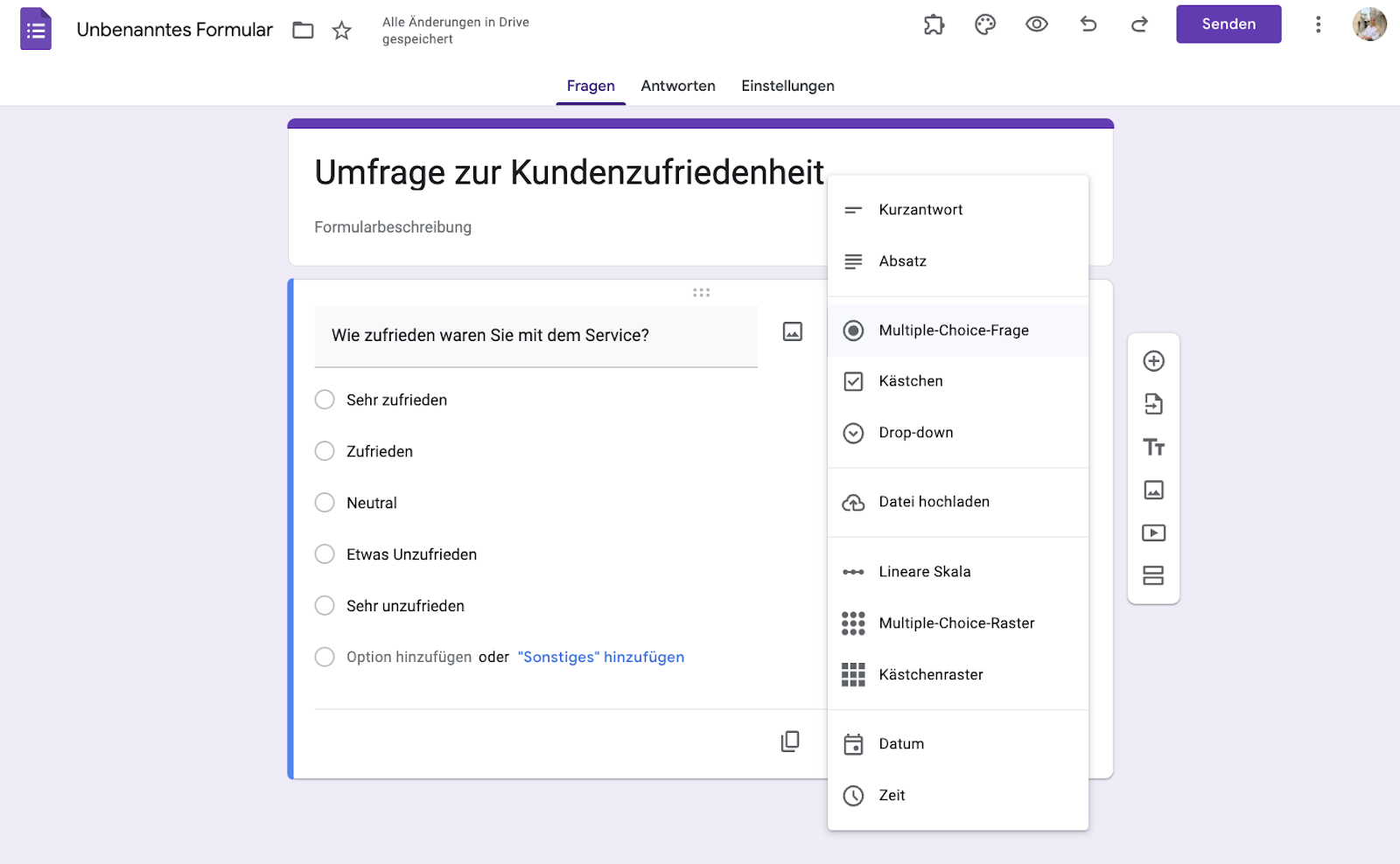 Im Gegensatz zu Microsoft Forms bietet Google Forms eine Reihe von Frageformaten, wie zum Beispiel lineare Skala, Dropdown und Multiple Choice.