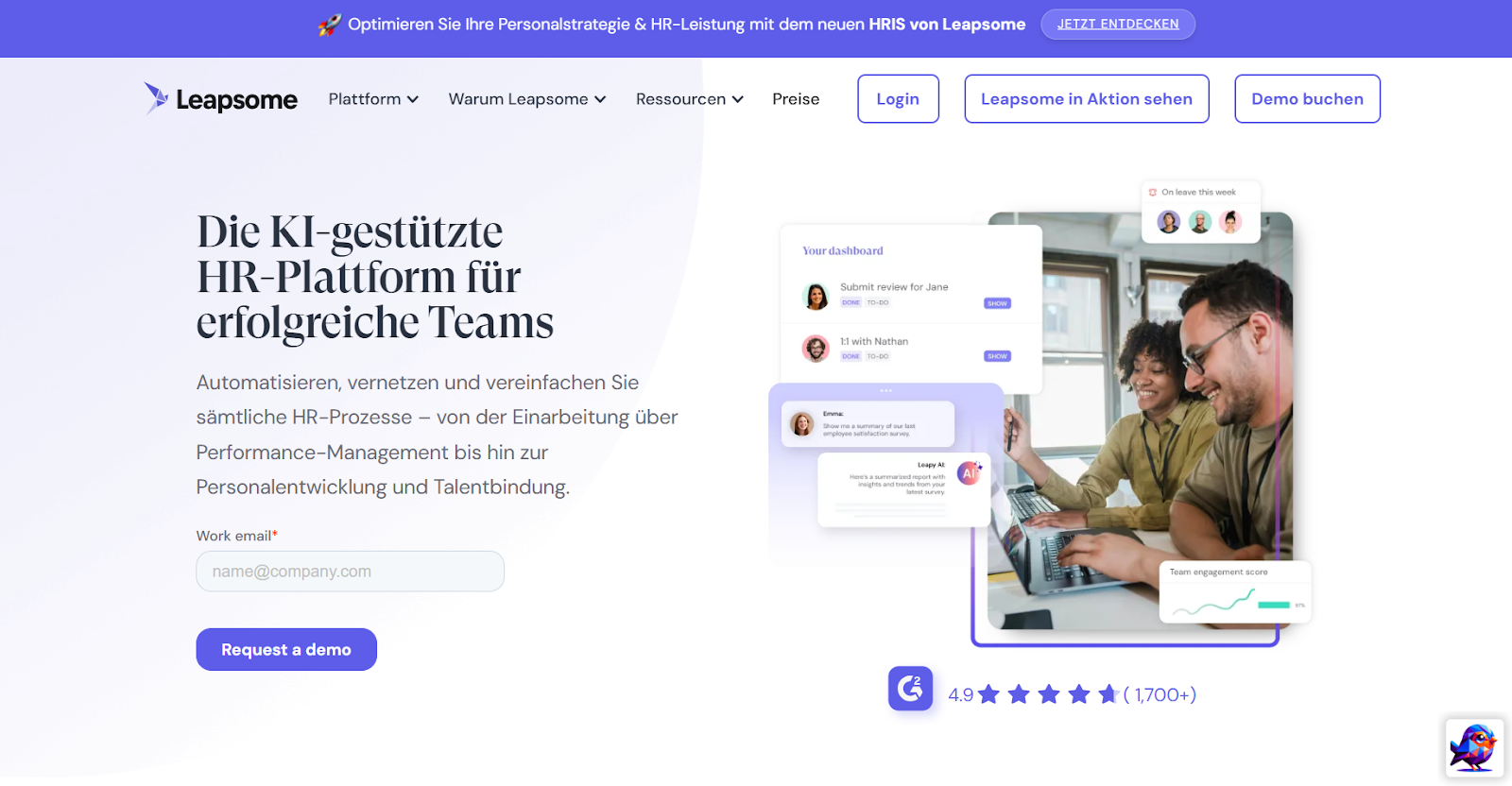 Leapsome ist eine All-in-One-HR-Plattform für Leistungsmanagement, Mitarbeiterengagement und Lernen. Leapsome wurde für die Unterstützung von Feedback-Kulturen entwickelt und kombiniert 360-Grad-Feedback, Umfragen zum Mitarbeiterengagement und KI-gesteuerte Analysen, was es zu einer ausgezeichneten Wahl für Unternehmen macht, die sich auf Mitarbeiterwachstum und -engagement konzentrieren.