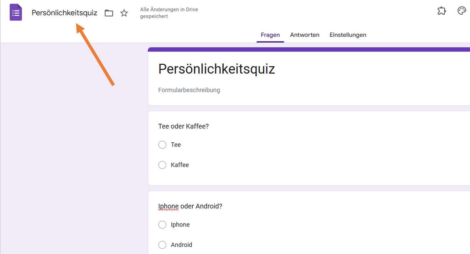 - Geben Sie in das Feld “Unbenanntes Formular” den Namen ein, den Sie Ihrem Quiz geben möchten, z. B. “Persönlichkeitsquiz”.