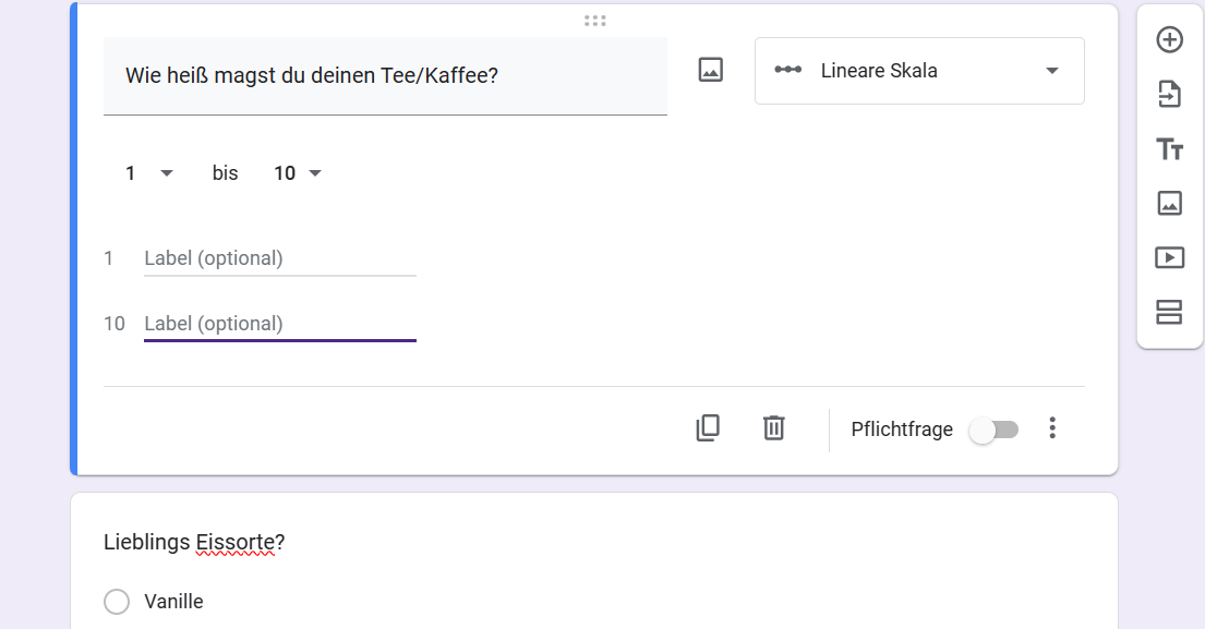 - Wenn Sie als Frageformat eine lineare Skala gewählt haben, klicken Sie in das Feld Beschriftung (optional), um Ihre Antworten hinzuzufügen.