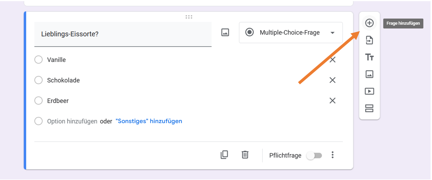 - Um die nächste Frage und den nächsten Satz von Antworten hinzuzufügen, klicken Sie einfach auf das + in dem vertikalen Feld auf der rechten Seite des Formulars.