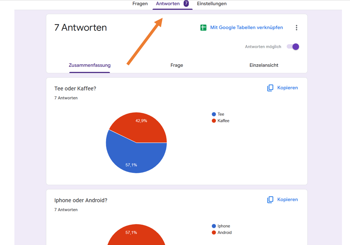 - Sobald Sie mit dem Erfassen von Antworten begonnen haben, können Sie diese auf demselben Bildschirm in Google Formulare anzeigen. Um auf das Feedback zuzugreifen, klicken Sie in der Mitte des Bildschirms auf Antworten.