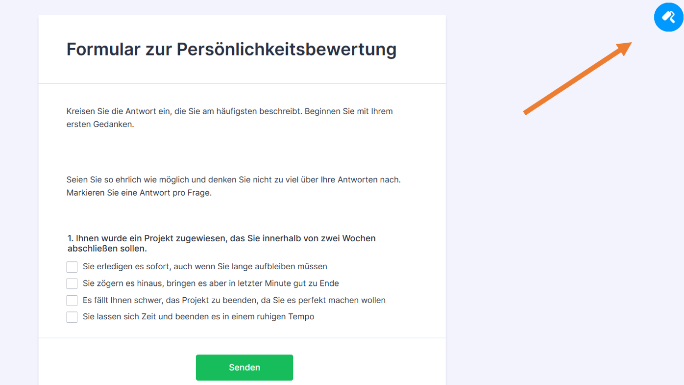 - Klicken Sie auf das blaue Farbroller-Symbol, um den Formulardesigner zu öffnen und mit der Anpassung Ihres Quizdesigns zu beginnen.