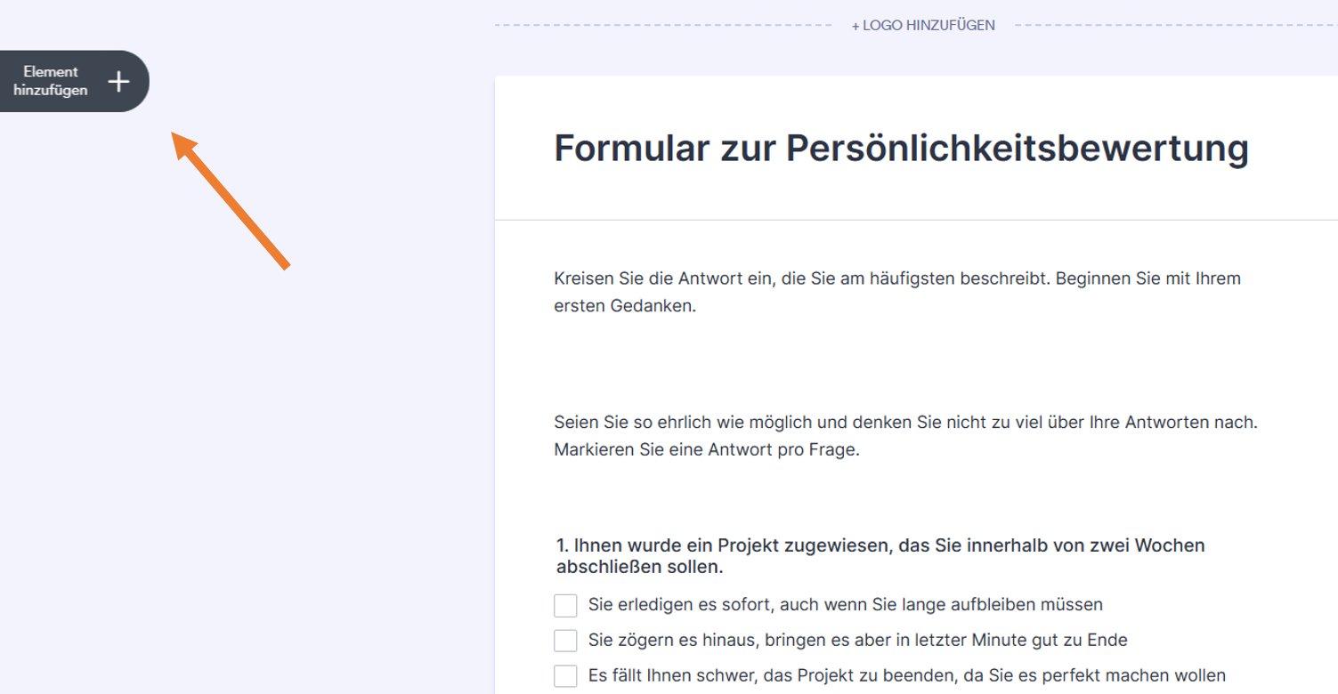 - Fügen Sie Fragen und Widgets hinzu, indem Sie sie per Drag & Drop aus dem Menü Element hinzufügen auf der linken Seite ziehen.