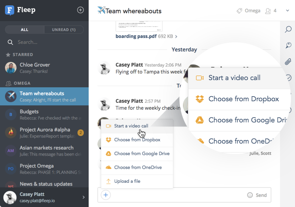 Im Gegensatz zu anderen Slack-Alternativen ist Fleep ein offenes Netzwerk, d. h. Sie können mit jeder anderen Person auf Fleep kommunizieren. Damit schließt die App die Lücke zwischen einem Posteingang und einem Business-Messenger. Fleep integriert E-Mails mit seinem eigenen Chatsystem, was besonders praktisch sein kann, wenn Sie Mitglied mehrerer Teams sind.