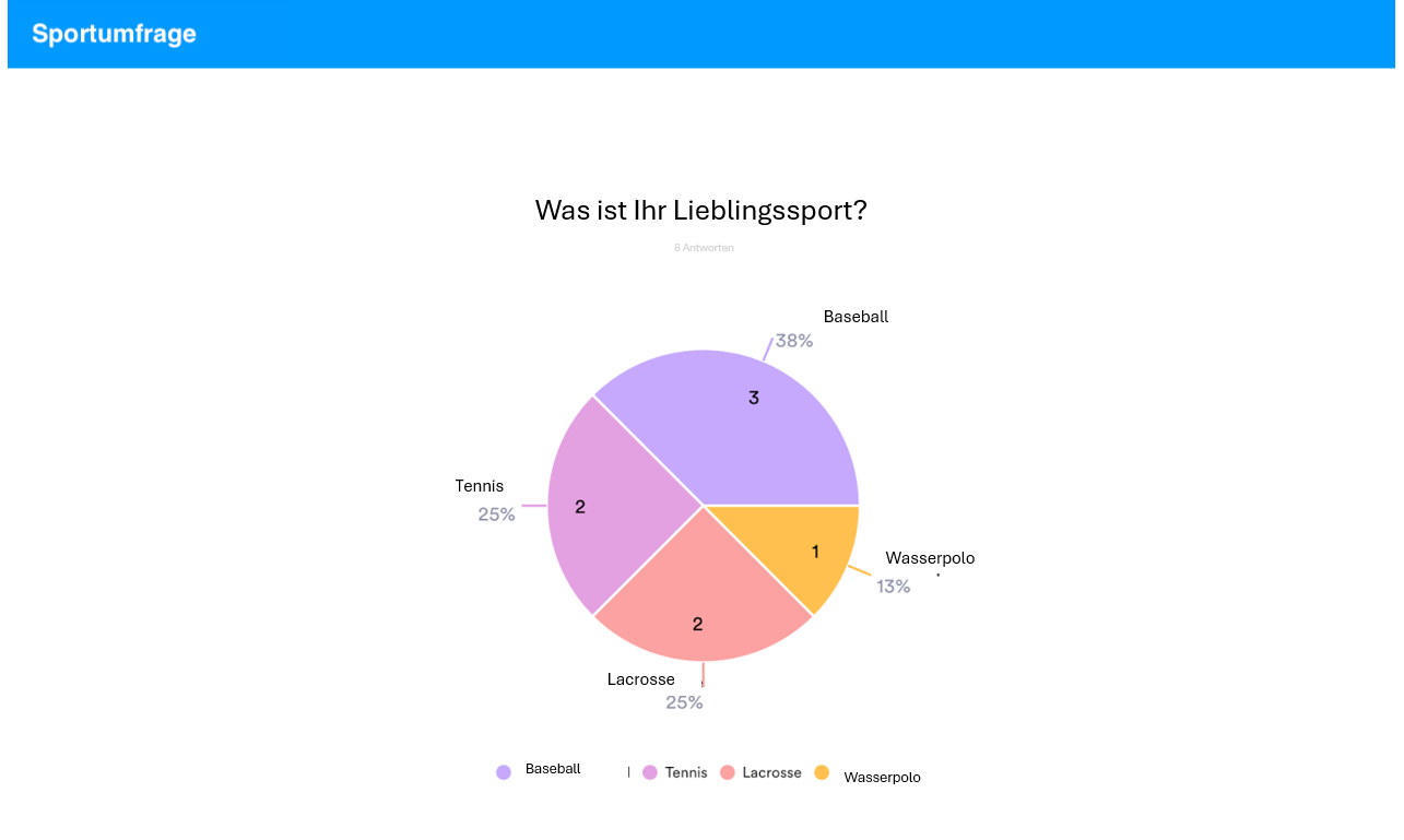 Sie können nicht nur die Art der in Ihrem Bericht angezeigten Grafiken oder Diagramme ändern, sondern auch angeben, wie viele Personen eine Frage beantwortet haben, wie viele Personen eine bestimmte Antwort ausgewählt haben und wie viele ausgewählte Antworten auf eine Frage einen bestimmten Prozentsatz aller Antworten ausmachen.