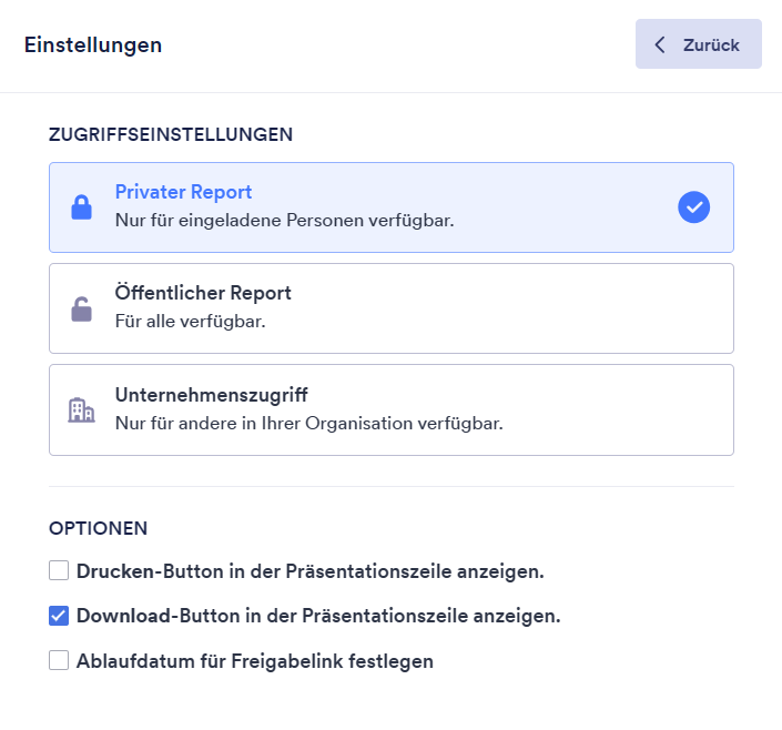Nachdem Sie einen gründlichen und attraktiven Bericht erstellt haben, der Ihren Anforderungen entspricht, können Sie den Bericht als PDF herunterladen, ausdrucken, in einer E-Mail mit einer personalisierten Nachricht weitergeben, über einen speziellen Link verteilen oder in eine Website einbetten.