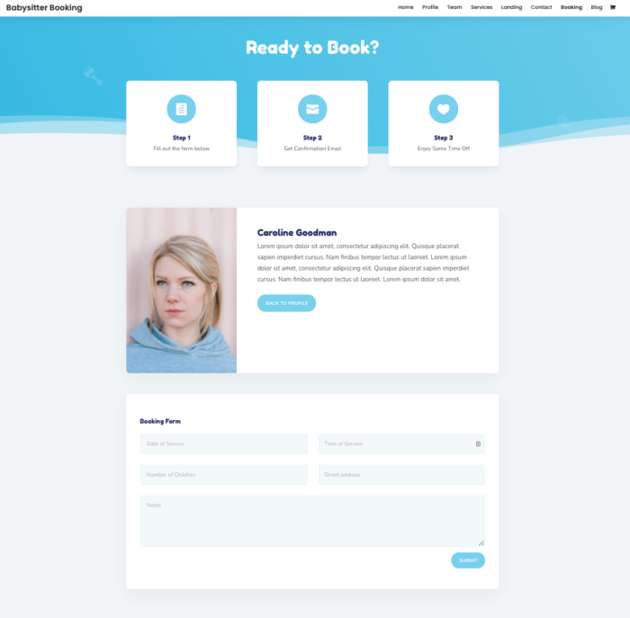 Dieses Beispiel zeigt eine Website für einen professionellen Babysitter-Service, die benutzerdefinierte Landing Pages mit CTAs und Kontaktformularen für jeden buchbaren Mitarbeiter enthält.