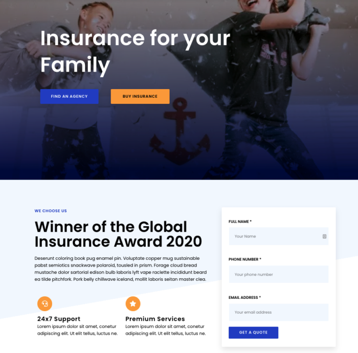 Auch dieses Versicherungsunternehmen generiert Leads auf der Startseite seiner Website mit dem Neve-Theme.