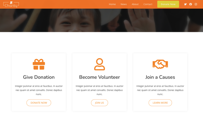 Dieses Bild von einer Wohltätigkeitsseite zeigt, wie Sie mehrere CTAs auf einer Seite einfügen können, um Ihre Botschaft an verschiedene Zielgruppen anzupassen.