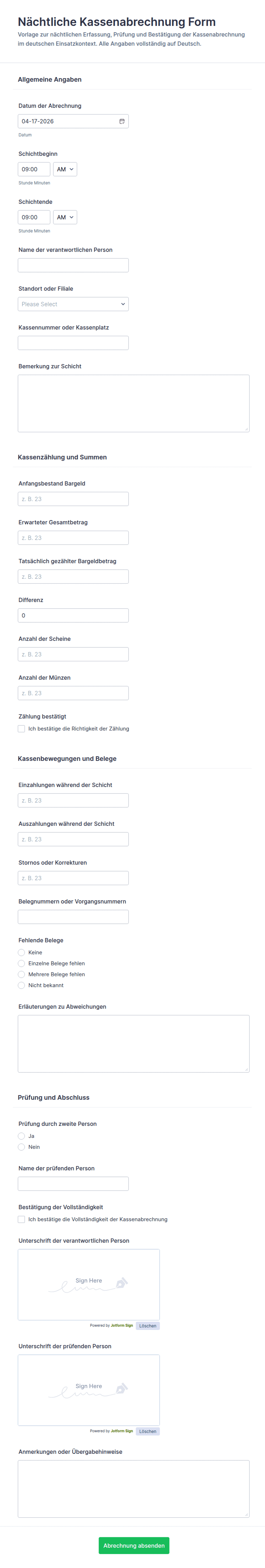 Mit Jotform können Benutzer ganz einfach online Meldeformulare für Schichten erstellen, anpassen und verwalten. Dadurch wird der Berichtsprozess optimiert und der Papierkram reduziert. Mithilfe des intuitiven Drag-and-Drop Formulargenerators von Jotform kann jeder ohne Programmierkenntnisse Formulare gestalten, relevante Felder hinzufügen und andere Tools für eine nahtlose Datenerfassung und -verwaltung integrieren. Die Antworten werden automatisch gespeichert und organisiert, sodass vergangene Berichte einfach überprüft, Trends verfolgt und die Compliance sichergestellt werden können. Durch die Nutzung dieser Funktionen können Unternehmen die Kommunikation zwischen den Schichten verbessern, die betriebliche Effizienz steigern und genaue Aufzeichnungen für Audits oder Leistungsbewertungen führen.