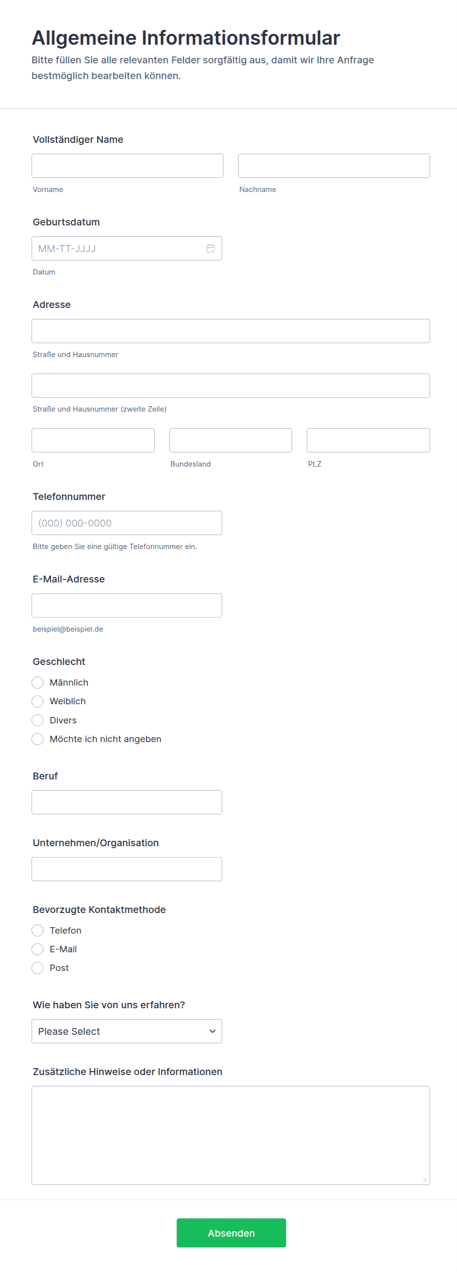 - Kunden Onboarding: Kann Felder für Kontaktdaten, Servicepräferenzen und Einverständniserklärungen enthalten.