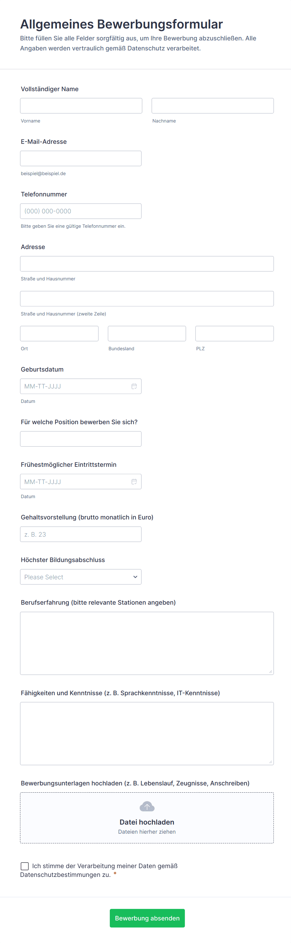 Zu den üblichen Feldern gehören Name, Kontaktdaten, gewünschte Position, Berufserfahrung, Ausbildung, Fähigkeiten und Referenzen. Manchmal sind auch Datei-Uploads für Lebensläufe oder Portfolios möglich.