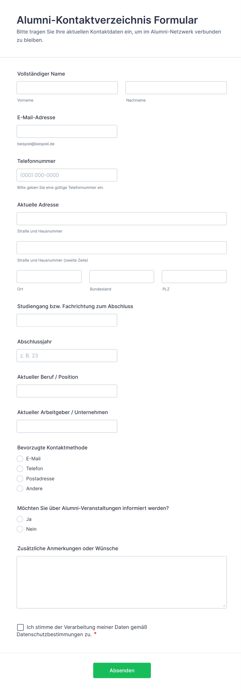 Online-Formulare sind eine effiziente Möglichkeit, um Alumni zu organisieren. Deswegen entscheiden sich viele für kostenlose Jotform Templates, die Sie ganz individuell an den Look Ihrer Organisation anpassen können. Erfassen Sie aktuelle Informationen von Alumni oder geben Sie ihnen die Möglichkeit, sich für einen Newsletter anzumelden. Starten Sie noch heute mit einem Formular-Template und erfassen Sie im Handumdrehen wertvolle Informationen!